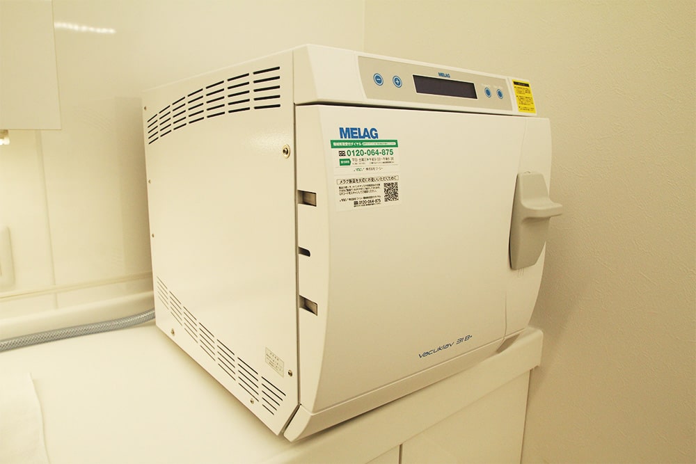 歯科診療では、中が空洞の物、複雑な形状の物など様々な診療器具を使用します。その内部にまで付着した細菌やウイルスを徹底的に死滅させるため、世界最高基準(クラスB)のハイレベルな高圧蒸気滅菌器を導入しております。真空状態と高圧による蒸気の注入を繰り返すことで、「消毒」や「殺菌」ではなく徹底的に菌を死滅することができ、常に安全な状態で診療を行っています。