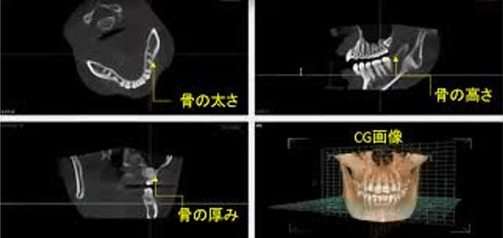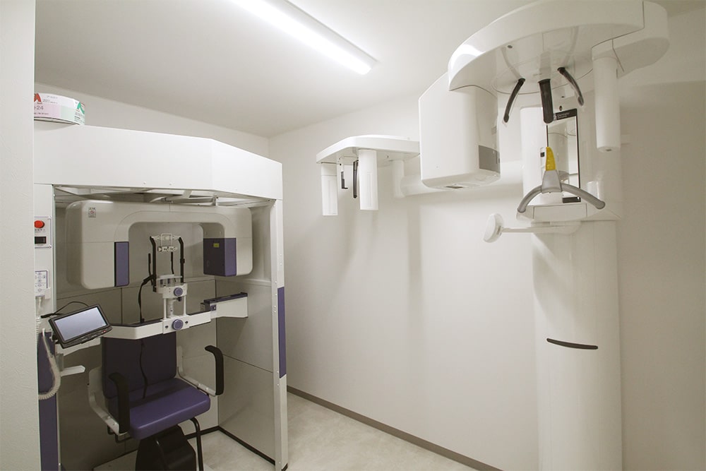 歯科用CTとは、コンピュータを駆使し、三次元の高画質画像を用いることで、骨の状態などが正確・高精度に診断できる装置のことを言います。CT撮影では今までの平面画像が3Dになり、骨の厚みや幅、硬さ、位置、歯の根の状態、歯周病の進行具合なども精密に分析することが出来、正確な診断を細かくすることが出来ることで、より高度で安全に治療を行うことが可能になります。